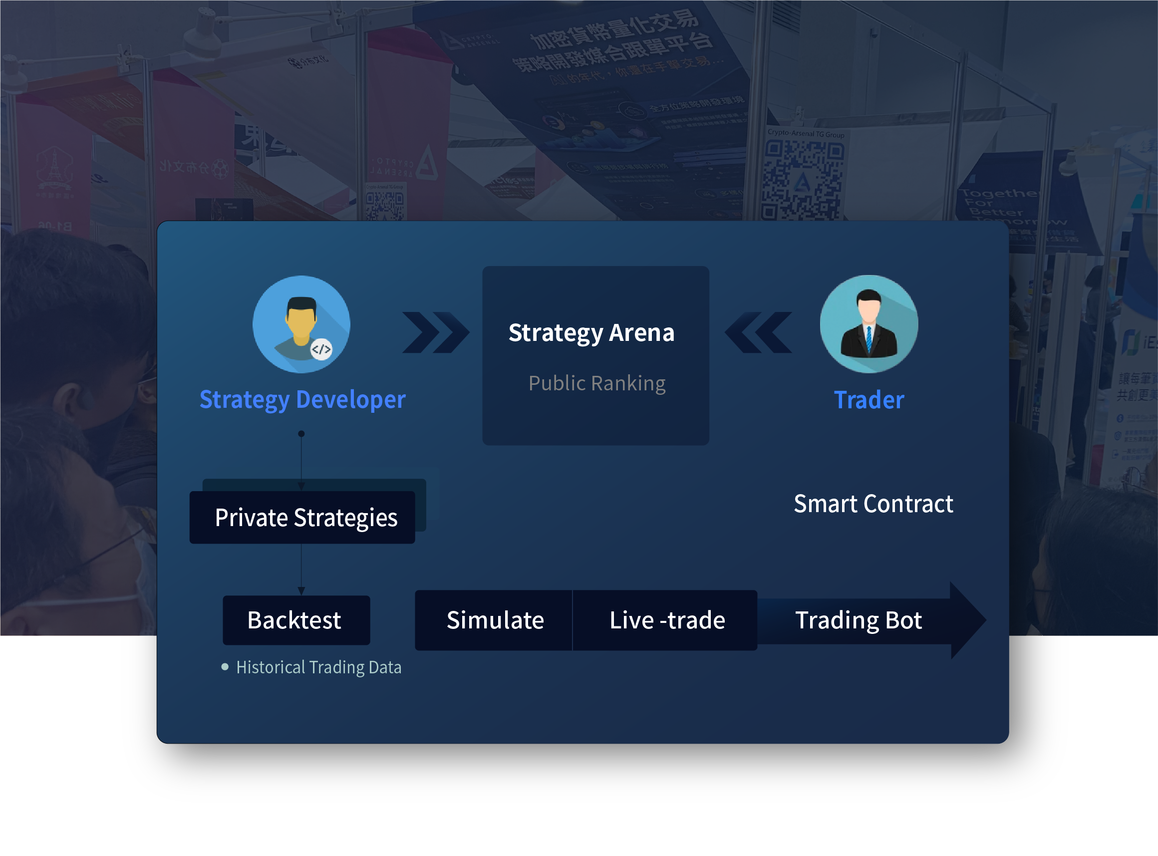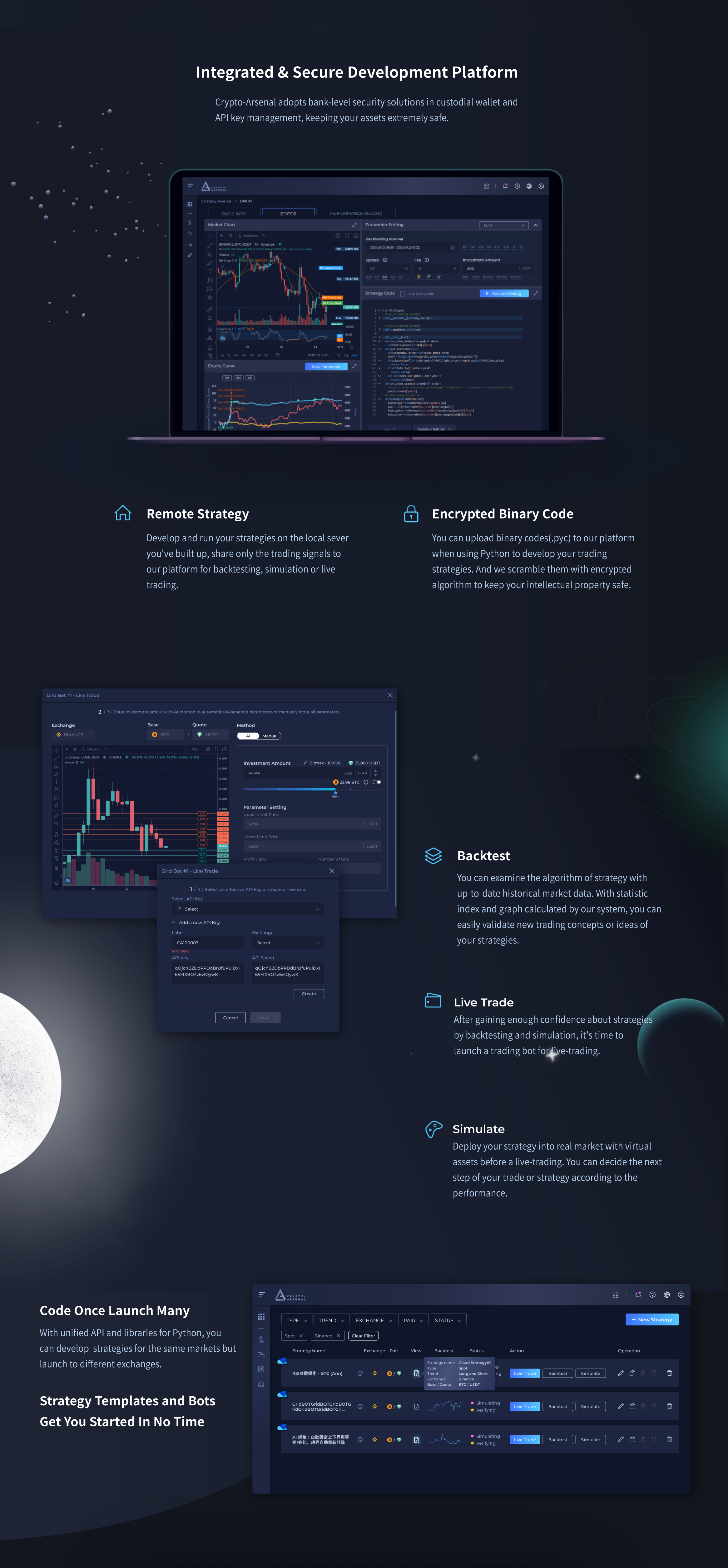 We provide an all-in-one strategy development environment which includes cloud-based and remote IDE, backtesting database, API connection to exchange for simulate and live-trading, and proprietary 'StrategyBot Engine.
